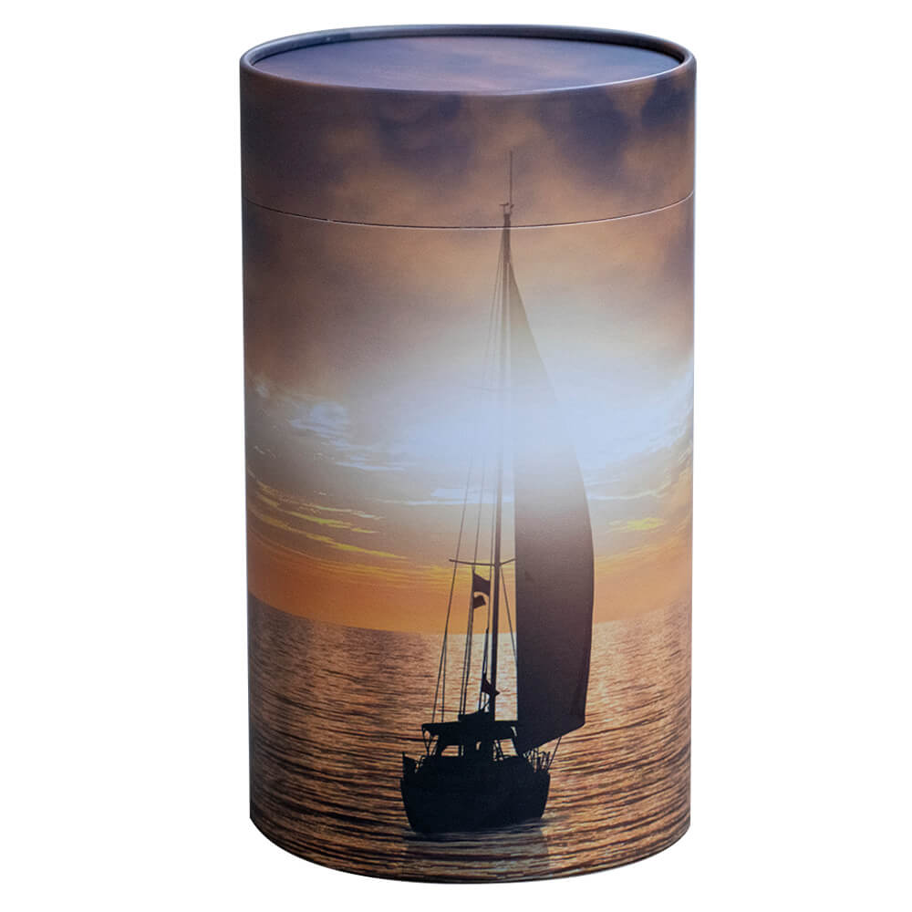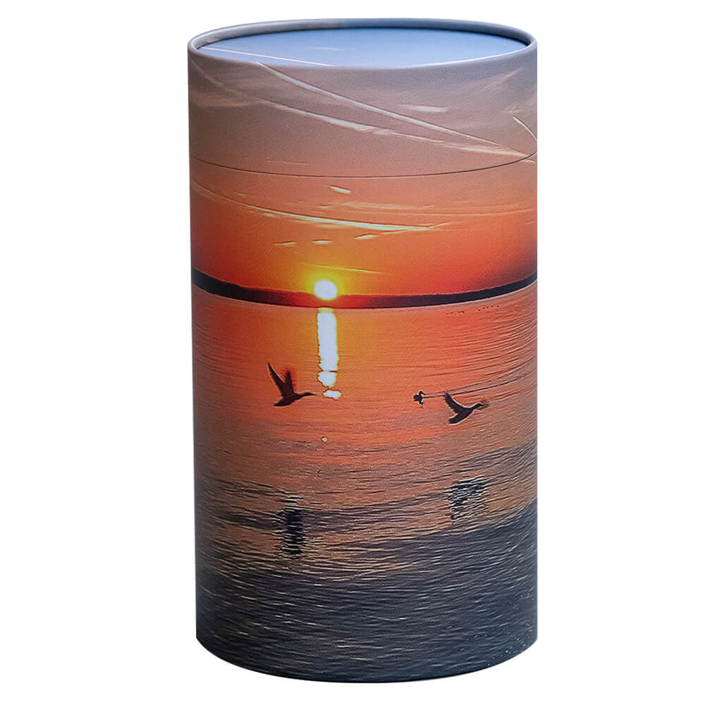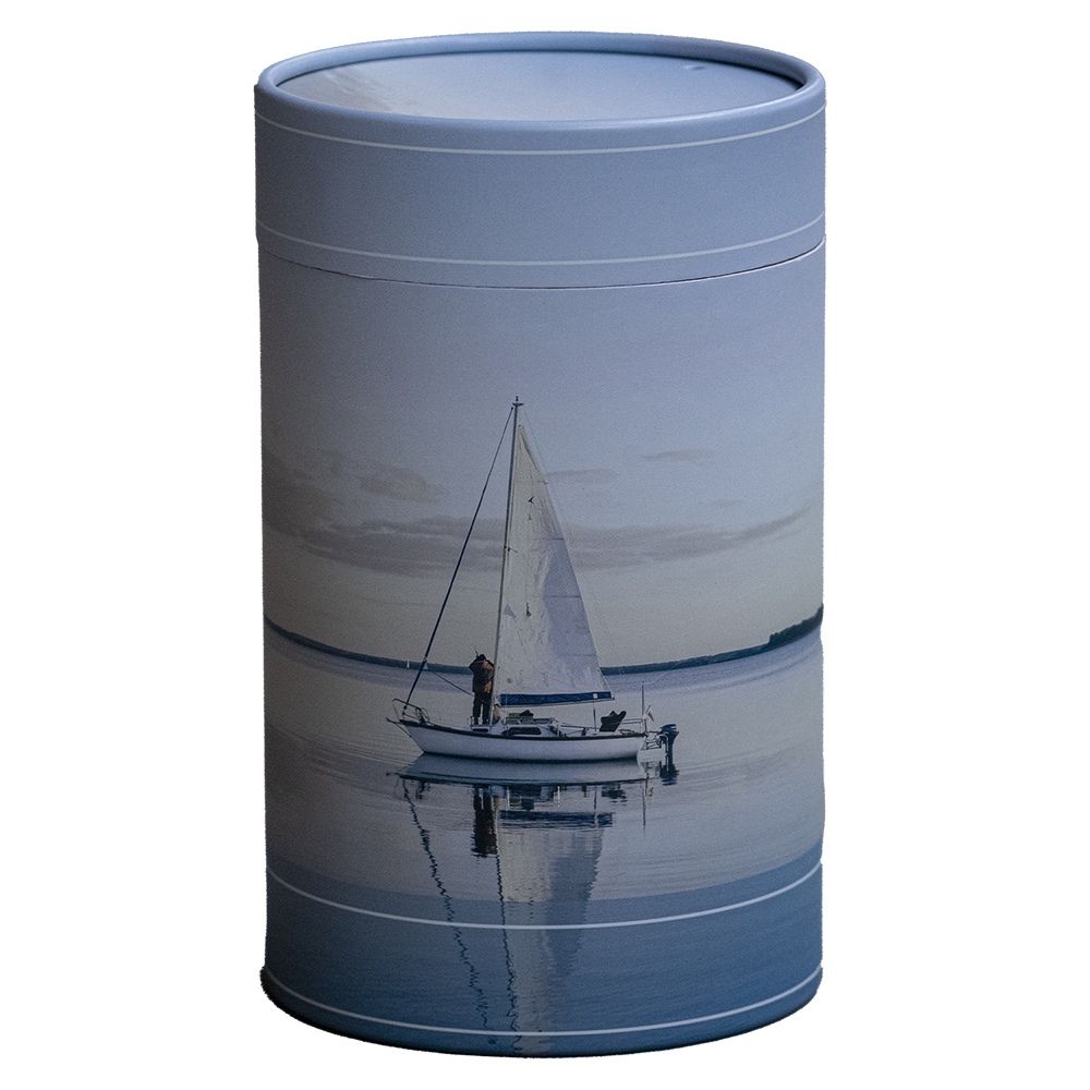 Benyttes ved askespredning over åbent hav. I som familie afhenter selv afslutningsvis askeurnen på krematorium eller i forretningen. Askespredningen skal foregå mindst 200 meter fra kysten, hvor I kan tage låget af urnerøret og gennemføre spredningen fra agter dæk, således at vind- og strømretning er væk fra båden. Urnerne er lavet i bionedbrydeligt materiale: 995 kr.