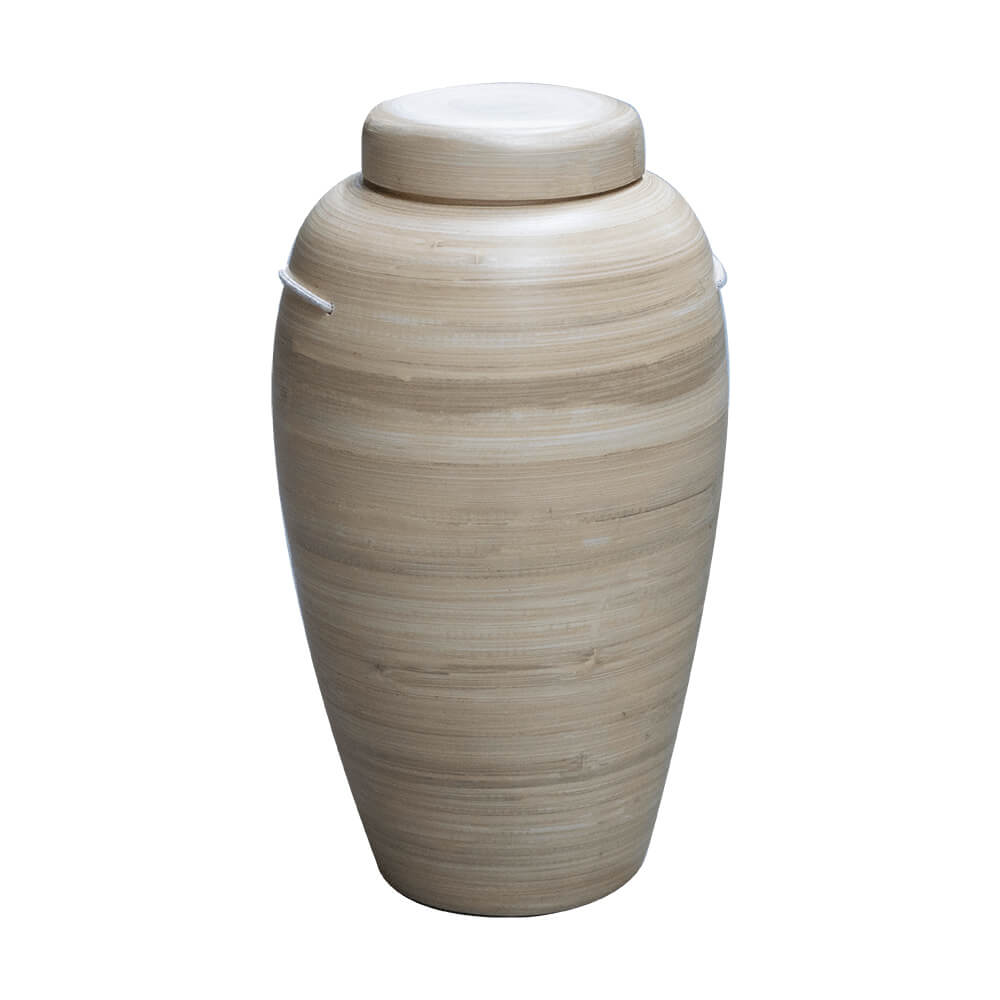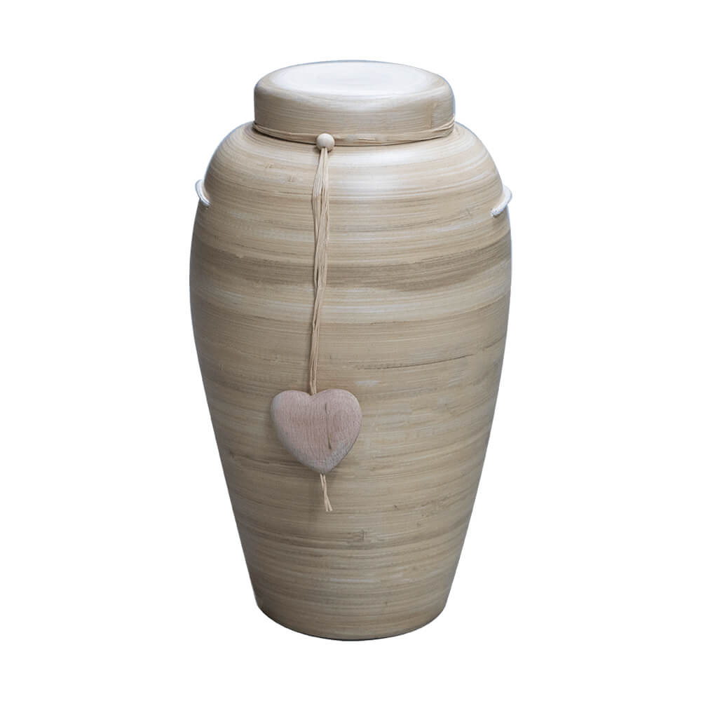 Naturvenlig bambus-urne produceret på dansk fabrik. Hvis du selv ønsker at afhente askeurnen på krematorium eller i forretningen, leveres askeurnen i en pæn transportkasse med hank. Leveres med hjerte: 1.300 kr.
