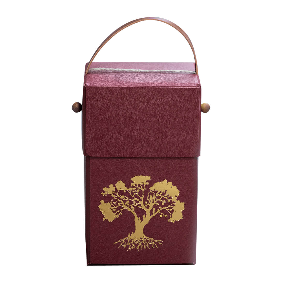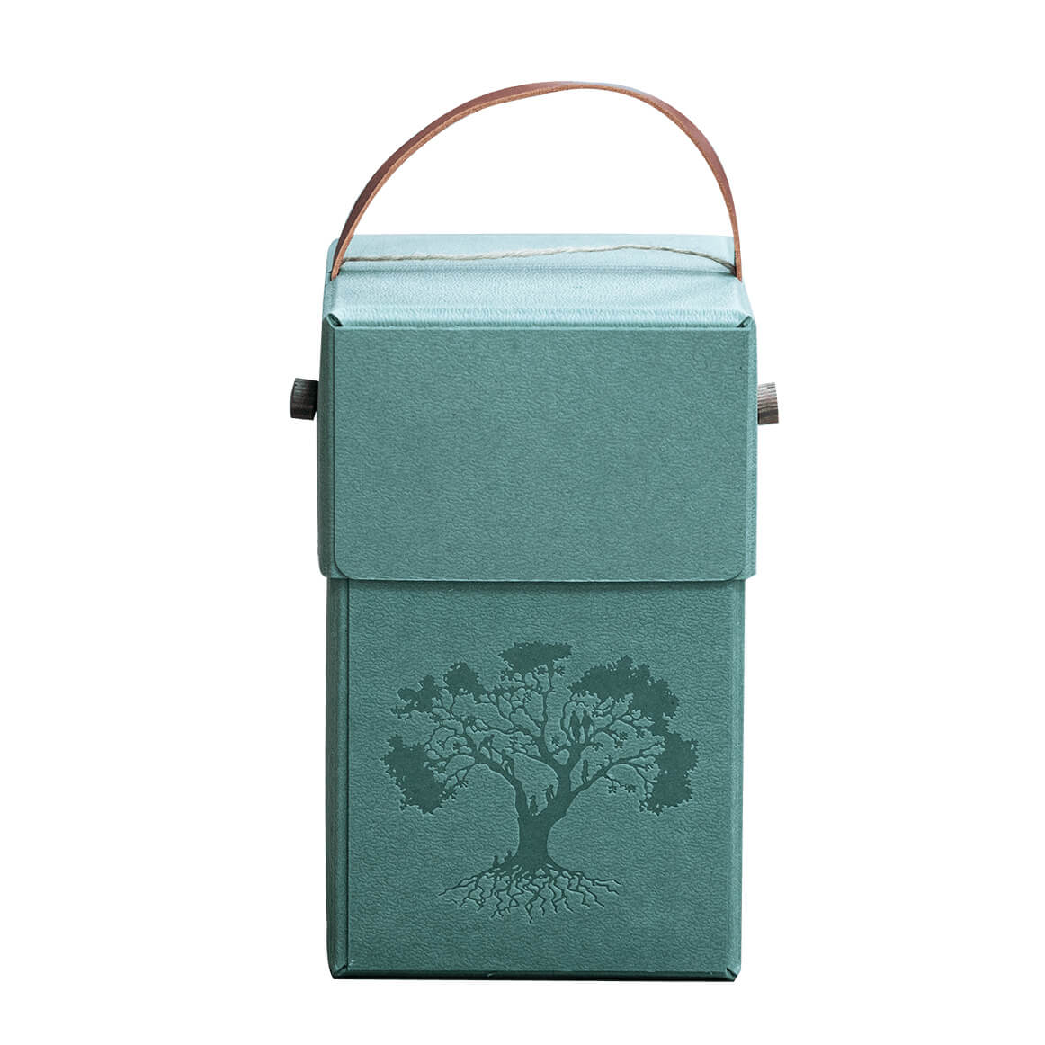 Bæredygtig pap-urne med læderhank og prægning med livets træ. Håndlavet på Viborg Arbejdende Museum. Urnen er godkendt for benyttelse på alle danske kirkegårde: 1.300 kr.