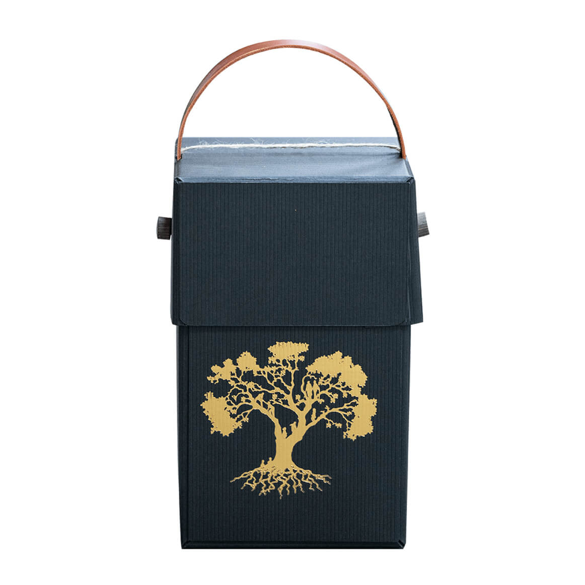 Består af to dele: den elegante yderkiste og den miljøvenlige inderkiste. Produceret i genanvendelige materialer. Yderkiste genanvendes ca. 20 gange.